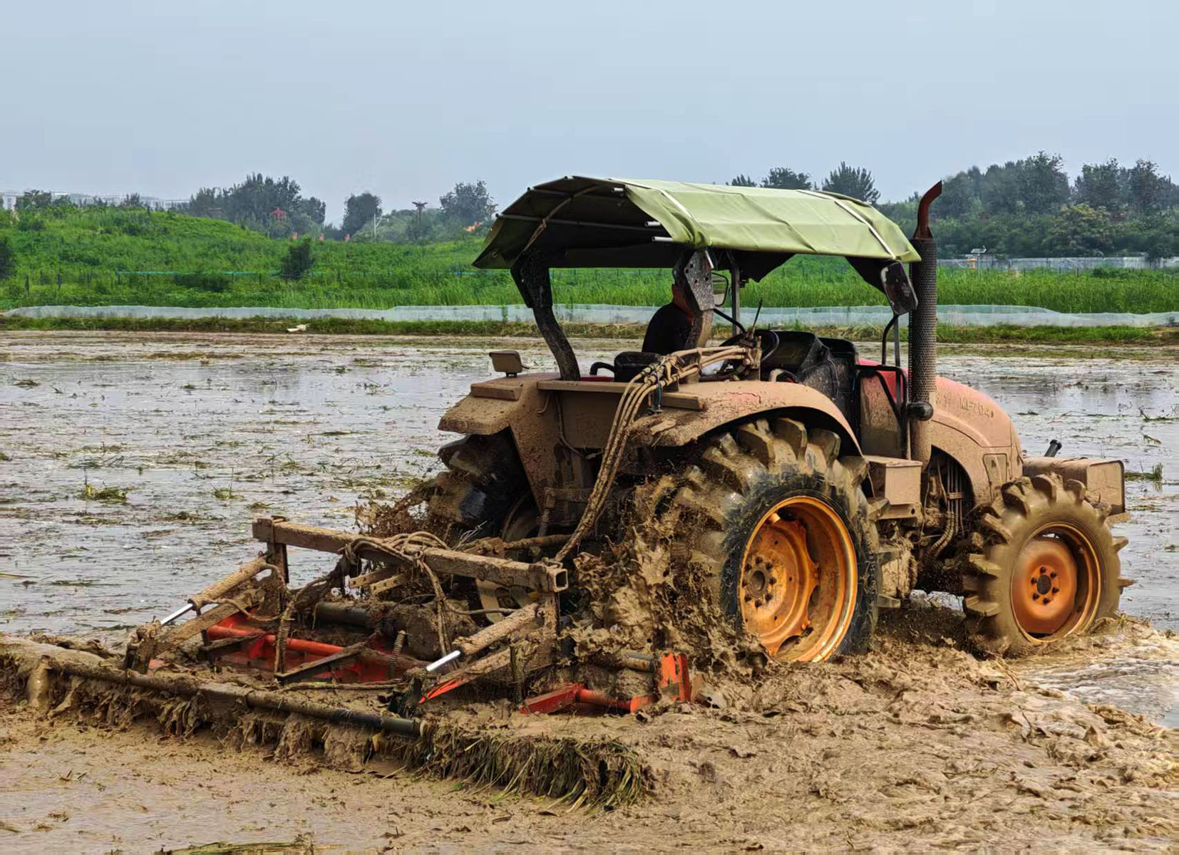 北京亦庄项目在实施以前是一篇杂草丛生的荒地,公司以全流程服务的形式承接了这个项目,合同包含:土地平整、翻耕、旋耕、打浆拉平、育苗、插秧、田间管理、收割。对于这个项目来说,田间管理是重点工作,为了保证画面效果除草是重心,所以为了尽可能消除后期的杂草隐患,打浆工作又尤为重要,为此每个田块都进行了3遍以上的打浆作业。