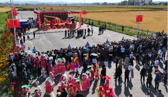 丰收的喜悦,总少不了热闹的相伴。东北秧歌扭起来,红绸带映着笑脸;歌舞表演轮番登场,宾朋齐聚话丰年。收割机的轰鸣再响,也盖不住人们爽朗的笑声;水塘里的虾蟹自在游弋,恰似为这片生态稻田的好品质 “点赞”。彩稻组成的画卷在金色稻海中舒展,每一粒饱满的稻穗,都在诉说着 “收成即希望,粮食连远方” 的故事。