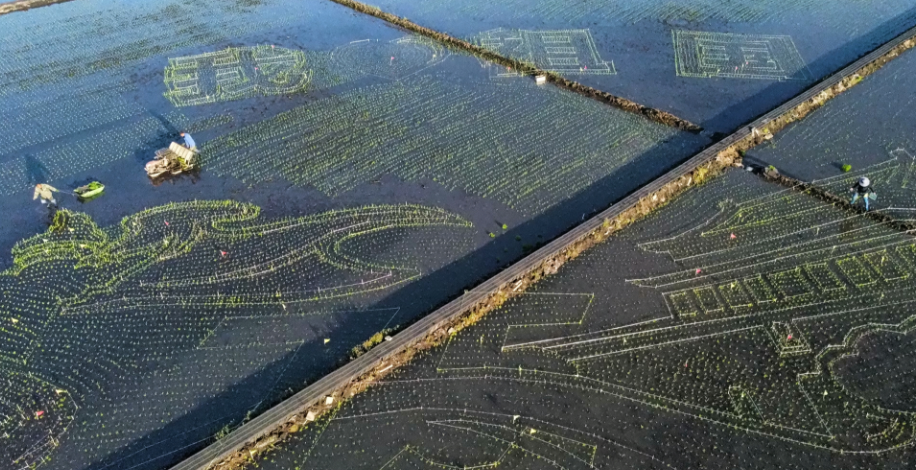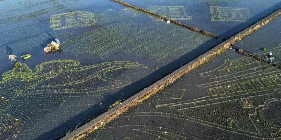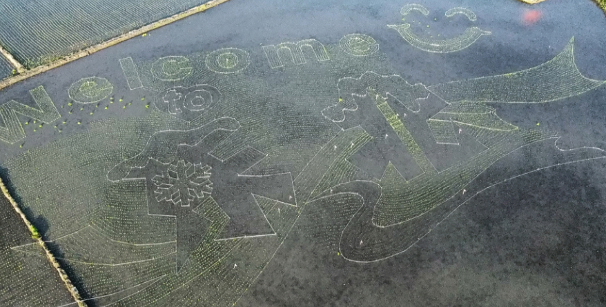 不过在东北制作稻田画也并非毫无挑战,团队初期就面临着两个新难题:其一是辽南地区的项目有大量沿海滩涂区域,土地盐碱化严重,彩稻种子必须要接受高盐高碱的考验,其二是黑龙江项目最北端已经接近中俄边境,昼夜温差大,彩稻种子必须要能经住这种寒流考验。