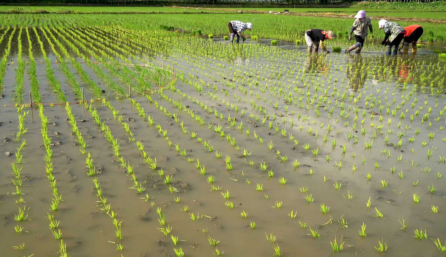 在开始稻田画画面定点工作2天以后就可以开始画面插秧工作了,插秧人员会将不同颜色的彩稻苗分别插到相应的画面区域。在这个过程中会根据不同颜色彩稻苗的特性调整插秧株距,以保证其特性的生成。