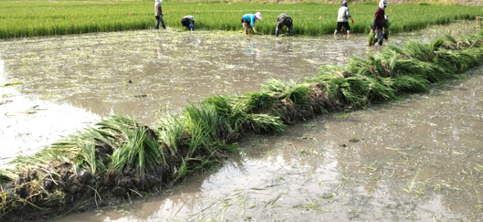由于风大的关系,一些重点区域的彩稻扦插我们要求深栽密植,在保证生长的条件下尽量做好抗风抗倒伏的准备,如果说平时在低纬度地区的施工难度为1的话,这里的难度最少也在3以上。