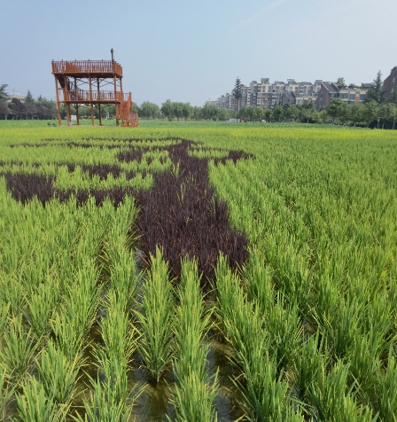 上图为我司为西工大长安校区创作的稻田画项目,目前已经成画将近40天时间,水稻生长状态非常健康,彩稻的颜色变化也比其它地方更加瑰丽,主要的秘诀就是水浇的比较频繁,这在北方算是一个刚需,旱田改造后至少要保证秧苗有15公分以上的存水。