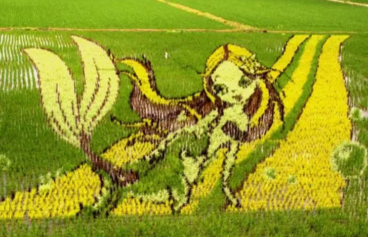 其次稻田画是由彩稻作为基础来打造的田园艺术,画面构成本身就受彩稻品种和农田条件所制约,典型如上面那副画作,画面人物设计非常“精美”,甚至光头发的波浪细节就用了不止一种颜色的水稻去表达,但奈何作物生长终究是有看天吃饭的必然,色差和显色状态任何设计师都无法左右,一味抠细节最后得到的结果只能是荒腔走板的滑稽戏,沦为产业笑柄。