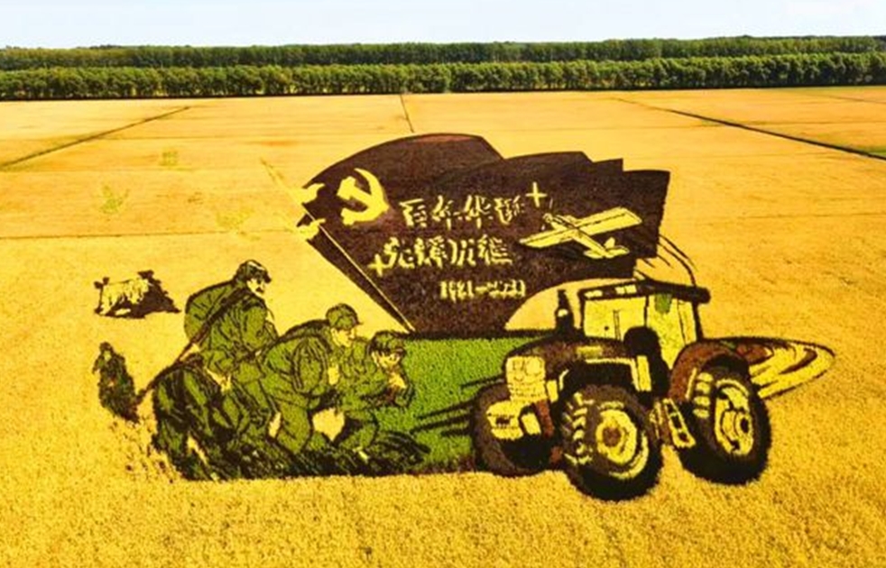 而真正适合稻田画创作的设计一定是大开大合的,充分利用宏大画幅展示雄浑意境的大手笔,它的线条一定是简洁而大方的,细节一定是本身就模糊而富于联想的,比如下面这幅画作中工农兵战士脚下的“草坪”本身就可以与彩稻的密植纹路合为一体,你根本找不到所谓细节的破绽,因为稻田就是草地的形变,设计师在构思伊始就将自然之美考虑在内了,这也是优秀设计公司必须要考虑的事情。
