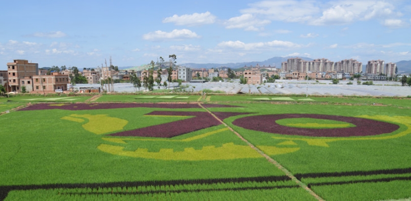 其次就是彩稻种子,不同地域的气温条件和土壤成分不一样,我们需要根据当地情况灵活调整彩稻的品种,确保最终的生长状态能满足我们的设计效果。比如东北西北地区就要选择耐寒类的小叶彩稻,而广东福建一带就可以用原生的热带品种,至于高原、山地区域因为昼夜温差较大,我们可以选用一些次生颜色来丰富画面细节。