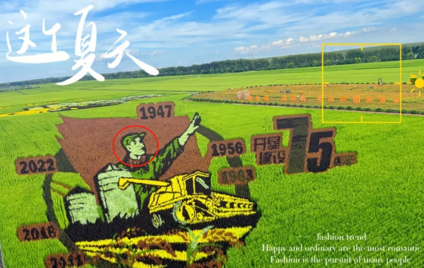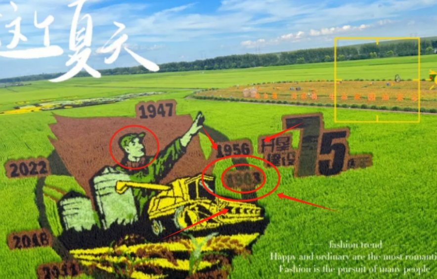 途中红圈里黑色数字部分就因为稻苗的发育问题出现了严重的色差,大大降低了整幅画面的一致性,甚至在前后相同的6组数字中显得比较模糊,这就是在水稻生长的后期没有把维护和保养纳入到前期考量,生长过程放任自由,完全没有人工干预,最后部分彩稻因为环境问题出现了营养不良,发育上的参差破坏了设计师的整体构想,最终的呈现效果大打折扣。