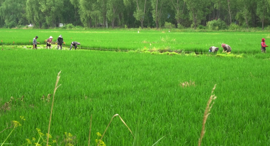 另外一个比较容易让人忽视的细节就是后期稻田的保养和维护,由于彩稻品种和颜色的不同,所以它们的生长周期也不一样,有时候向阳的苗长的高,背阴的就长得低,深色的稻苗长得快,浅色的苗就长得慢,如果不加入人工干预就会出现严重的现场色差,咱们还是以刚才这张画为例子……