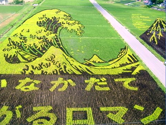 但是也有特殊情况,比如画面设计的图案弯折和层次太多,那么在设计费用上虽然一视同仁,但考虑到现实中的施工难度,行业内一般都会根据画面复杂程度上浮一个系数,比如下面这幅图虽然面积不算大,但整体造型充满了不规则的弯折和弧度,这就会让稻田里的扦插定位点数量呈指数级上涨,特别是其中的日语部分,简直没有横平竖直的概念,其工作量是相同面积汉字的好几倍,所以有时候画面上小小几个特殊符号或者几句外文俚语就会大幅增加施工难度。