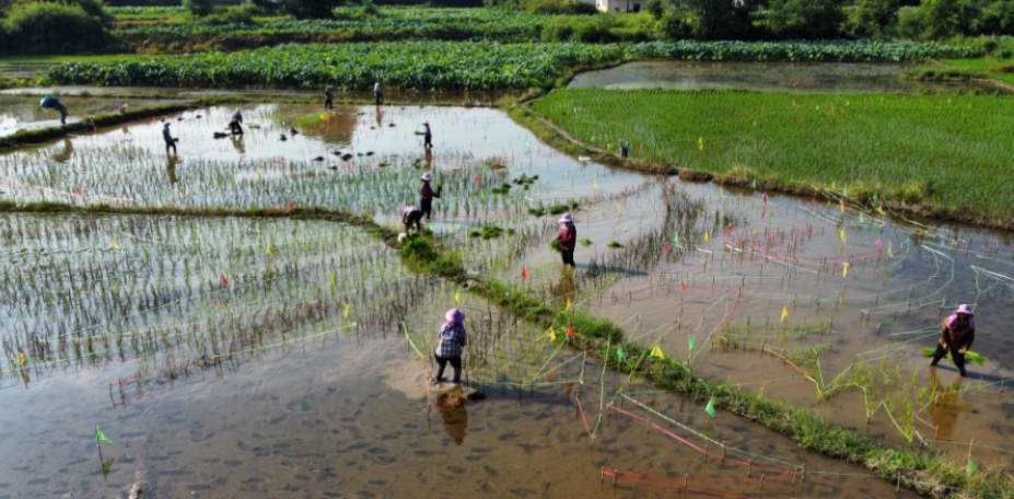 多组协同,通过轮换的方式减少高温下的单人工作时长,工期宝贵,健康无价,只有把施工规划尽可能的合理化才能保证夏季稻田画的顺利施工。